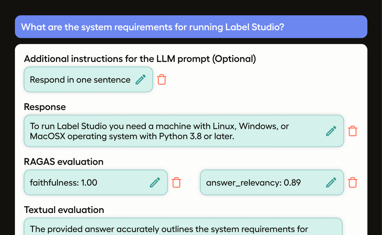 This template requires an ML backend to work. Follow the instructions outlined in RAG Quickstart Labeling to connect the ML backend to your project.