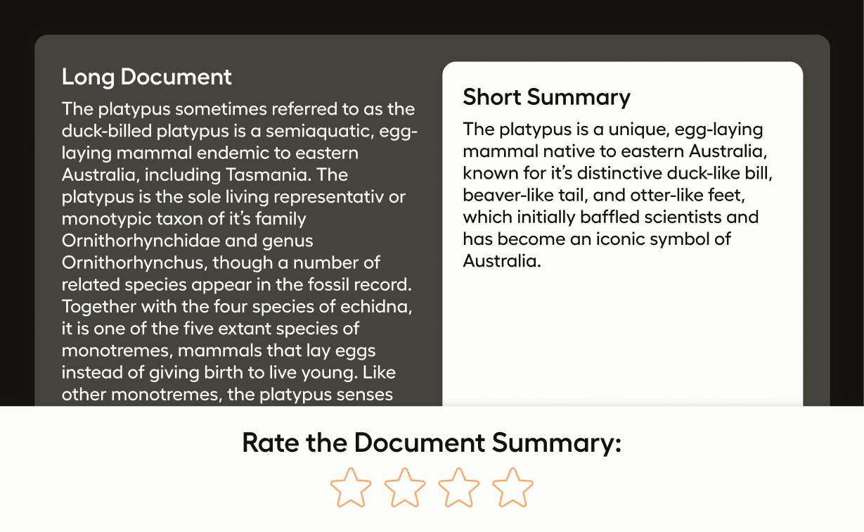 In this example, you are grading an LLM’s ability to summarize a document. The input data includes the document and the summary, and then you are rating the summary on a scale of 1 through 5.